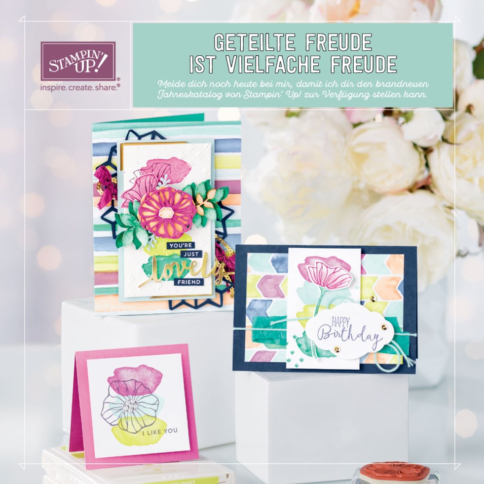 Und das pünktlich zum Erscheinen des neuen Jahreskatalogs von Stampin‘ Up!, seit dem 1. Juni dürfen wir Demonstratorinnen die Bilder aus dem neuen Katalog veröffentlichen und Bestellungen unserer Kundinnen entgegennehmen, so viel sei jetzt schon gesagt: Es ist wieder einmal großartig, so großartig, dass man ein bisschen die Tränchen über das Verschwinden der beiden letzten Kataloge vergisst und sich für neue Produkte begeistern kann.