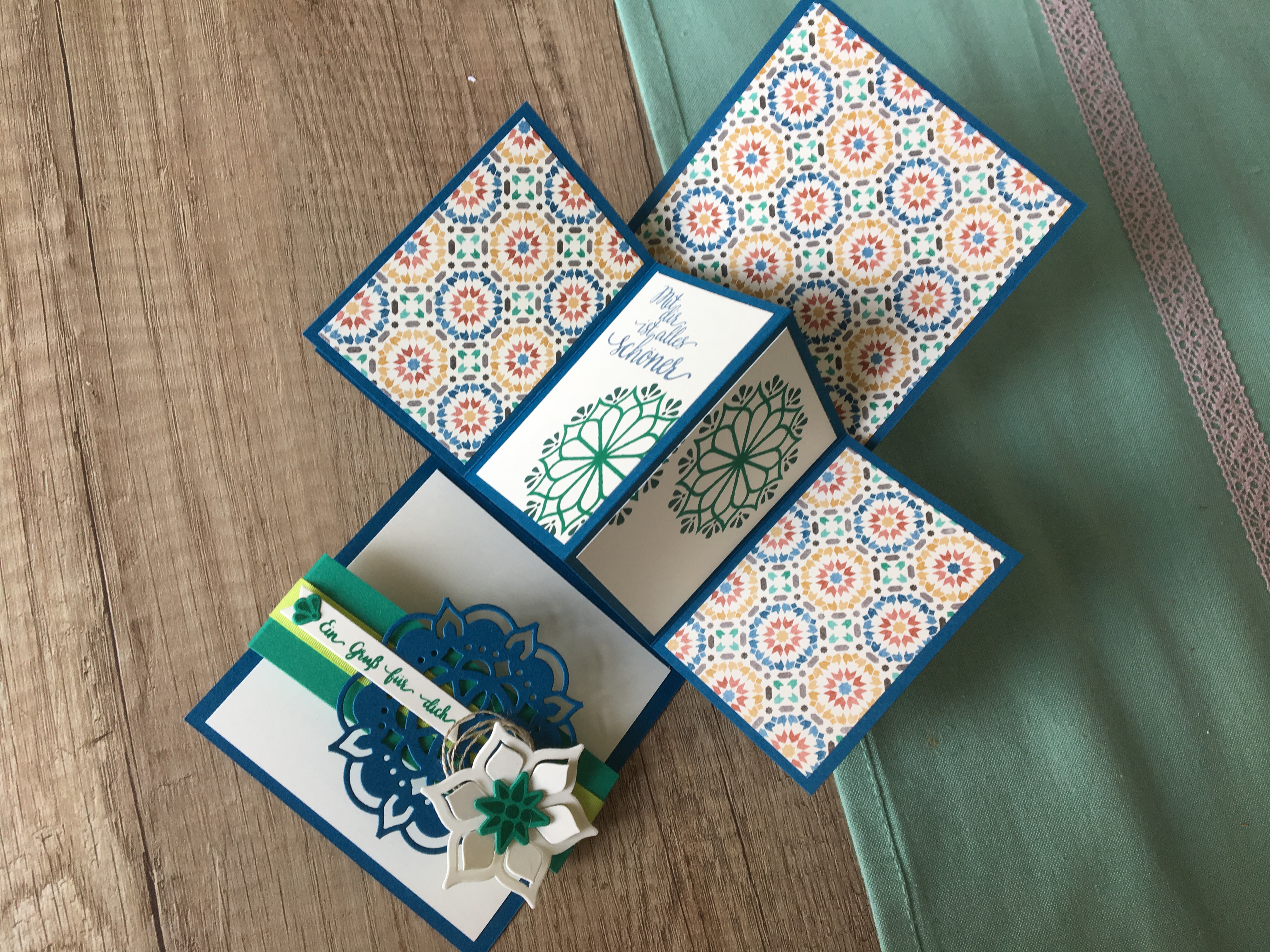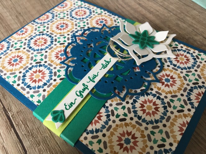 Außerdem dürfen wir uns darüber freuen, unser Marroko Designerpapier aus dem letzten Katalog noch nicht verbraucht zu haben: Es passt hervorragend zur Produktreihe Orientpalast!