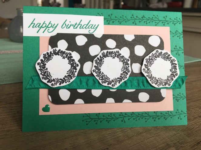 Mein Modell ist in Smaragdgrün, Schwarz und Puderrosa gehalten, die geblümten Kränze und die Ranken im Hintergrund -die ich übrigens unbedingt noch einmal benutzen werde, weil man das Muster, was ich damit gestempelt habe, unter dem Stück Farbkarton in Puderrosa fast nicht mehr sieht – sind aus dem Set ‚Populär‘, der Spruch aus den ‚Birthday Blossoms‘. Das Designerpapier ist dasselbe wie letzte Woche, ‚Allerliebst‘ hat viel schwarzgründiges zu bieten, was mir daran unheimlich gut gefällt.