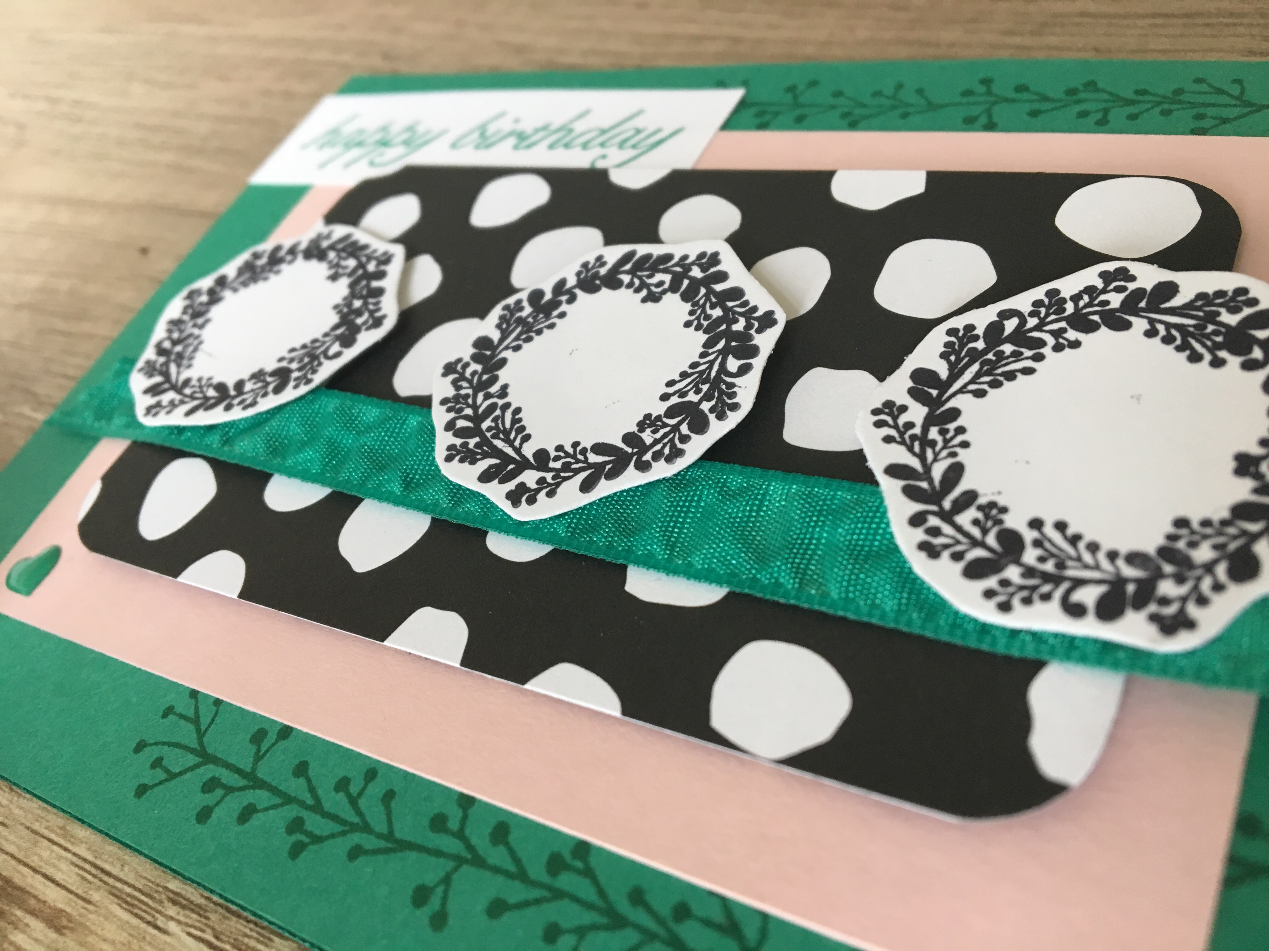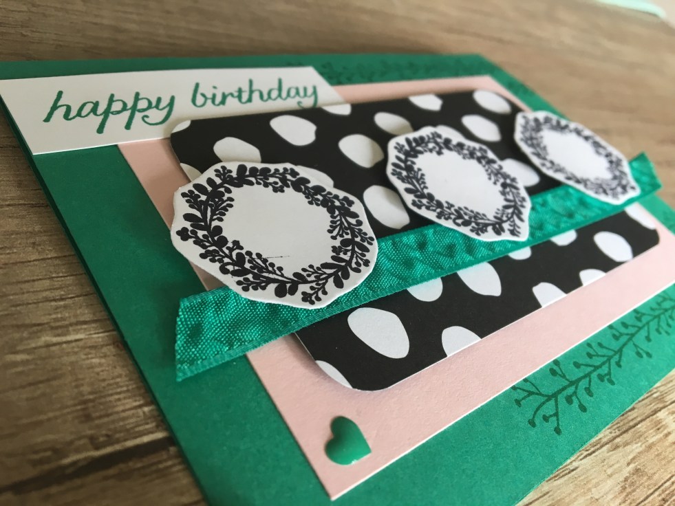 Mein Modell ist in Smaragdgrün, Schwarz und Puderrosa gehalten, die geblümten Kränze und die Ranken im Hintergrund -die ich übrigens unbedingt noch einmal benutzen werde, weil man das Muster, was ich damit gestempelt habe, unter dem Stück Farbkarton in Puderrosa fast nicht mehr sieht – sind aus dem Set ‚Populär‘, der Spruch aus den ‚Birthday Blossoms‘. Das Designerpapier ist dasselbe wie letzte Woche, ‚Allerliebst‘ hat viel schwarzgründiges zu bieten, was mir daran unheimlich gut gefällt.