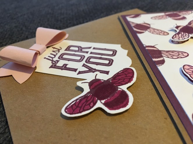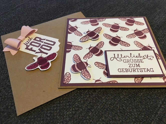 Die Hummelkarte ist in Feige und Puderrosa gestempelt, der Craft-Ton für den Hintergund passt, wie ich finde, hervorragend dazu und mit einem kurzen schnippeln benötigte man nicht einmal unbedingt die passenden Thinlits. Allerdings kann ich sie für den Libellenschwarm nur empfehlen, ihr werdet noch einiges davon sehen, denke ich 🙂