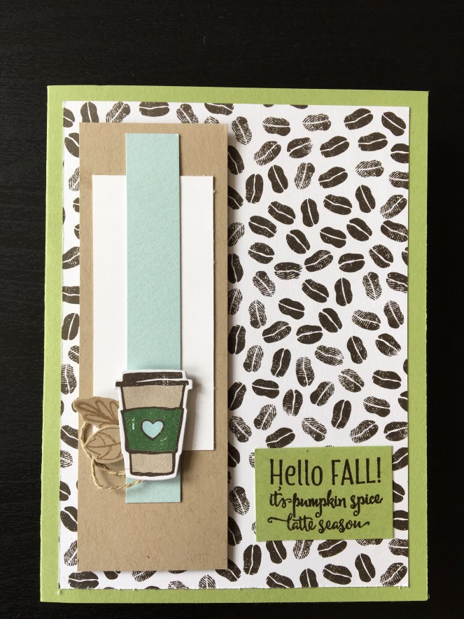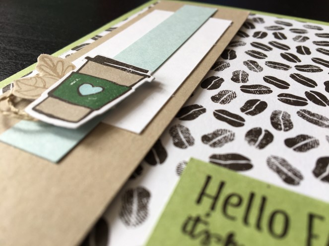 Nun zum Kärtchen: meine Grundkarte und das Stück mit dem Spruch sind Farngrün, dazu passt das Designerpapier Kaffeepause ganz wunderbar, aus dem sowohl das Hintergrundpapier als auch das Coffee to Go Becherchen ausgeschnitten sind. Weiter habe ich mit Karton in Savanne, Himmelblau und Flüsterweiß gearbeitet, damit alles zum Farbschema passte. Dafür liebe ich die Produkte von Stampin‘ Up!