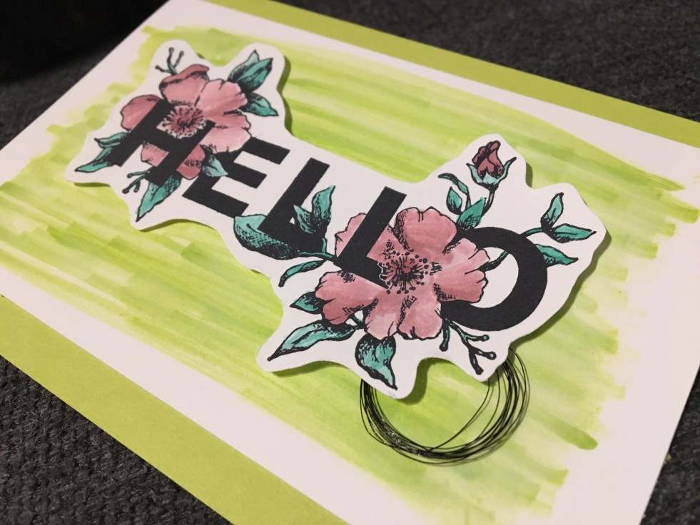 Meine Grundkarte habe ich aus Farbkarton in Limette gebastelt, darauf ein Stück Flüsterweiß, dass ich erst mit dem Mischstift in Limette gefärbt und dann mit dem Aquapainter für weichere Linien nachgeholfen habe. Darüber klebt der ausgeschnittene Schriftzug „Hello“, der mit dem Mischstift in Meeresgrün und Zarte Pflaume eingefärbt wurde. Für den 3D Effekt habe ich ihn mit Dimensionals etwas angehoben und ein Stück Metallic Faden in schwarz darunter gekringelt.