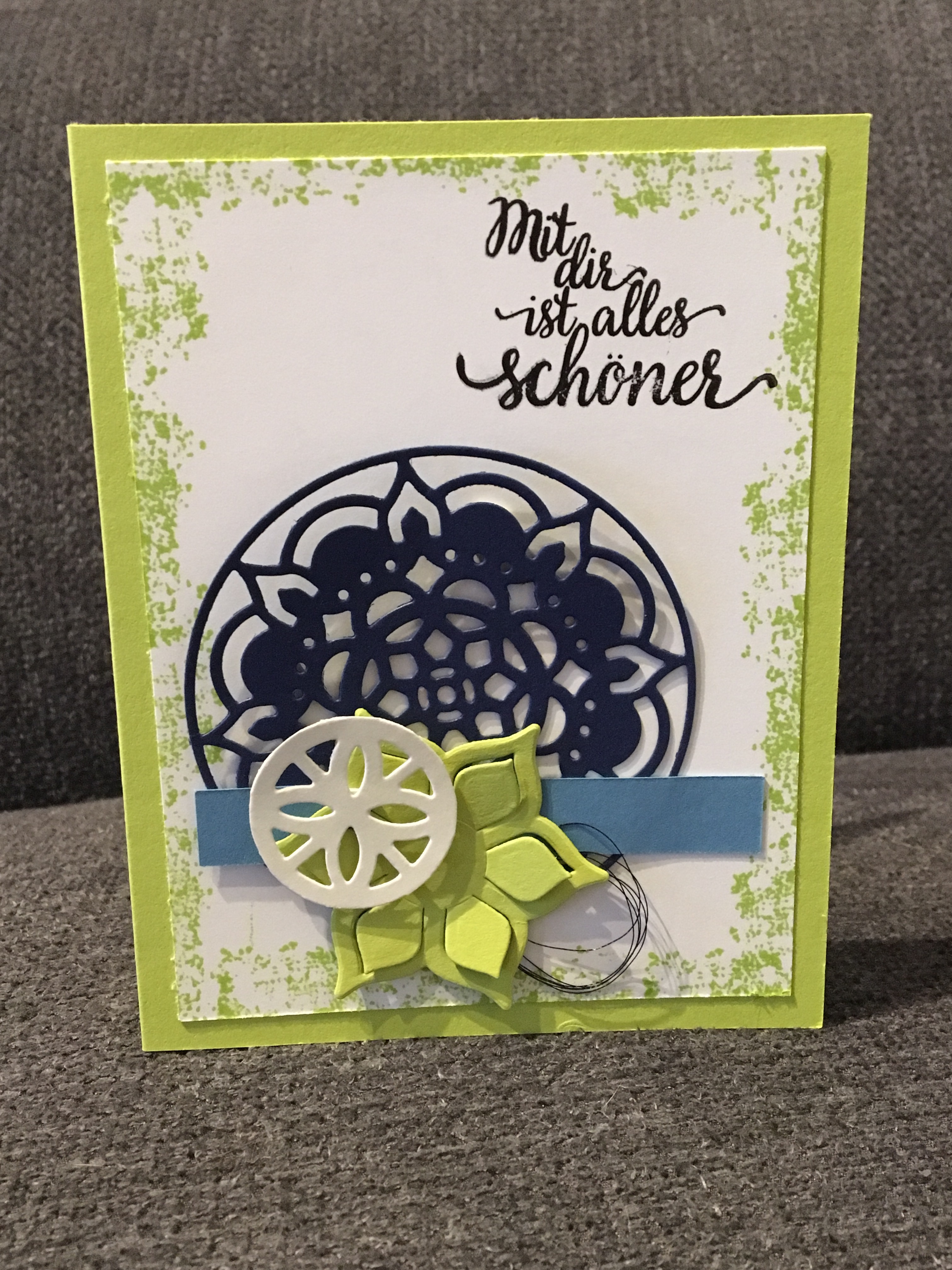 Mein Design ist diese Woche mit dem allseits bekannten und bei mir immer noch sehr sehr beliebten Orientpalast entstanden 🙂 die Thinlits und das Stempelset „Schönheit des Orients“ haben wunderbare Muster, die frei kombinierbar sind und tolle Sprüche für jeden Anlass. Auch eben sehr neutrale wie den, den ich ausgesucht habe: Mit dir ist alles schöner.