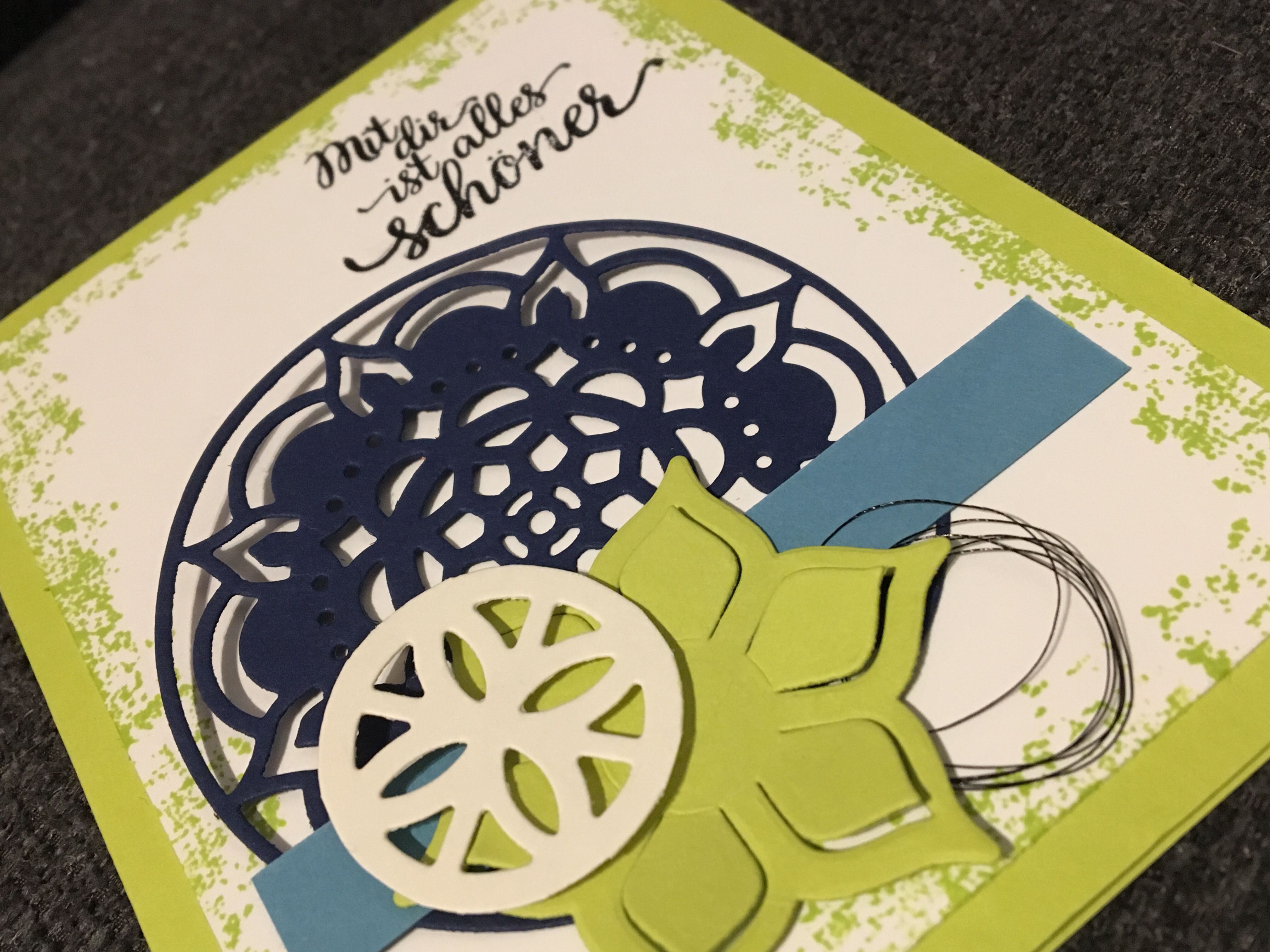 Die drei Orientelemente sind von groß nach klein in Marineblau, Limette und Vanille pur mit der Big Shot ausgestanzt. Der Streifen ist aus Ozeanblauem Farbkarton geschnitten und ein schwarzer Metallic-Faden rundet das ganze Geschehen etwas ab. Der Spruch ist einfach in schwarz gestempelt und fertig ist das gute Stück!