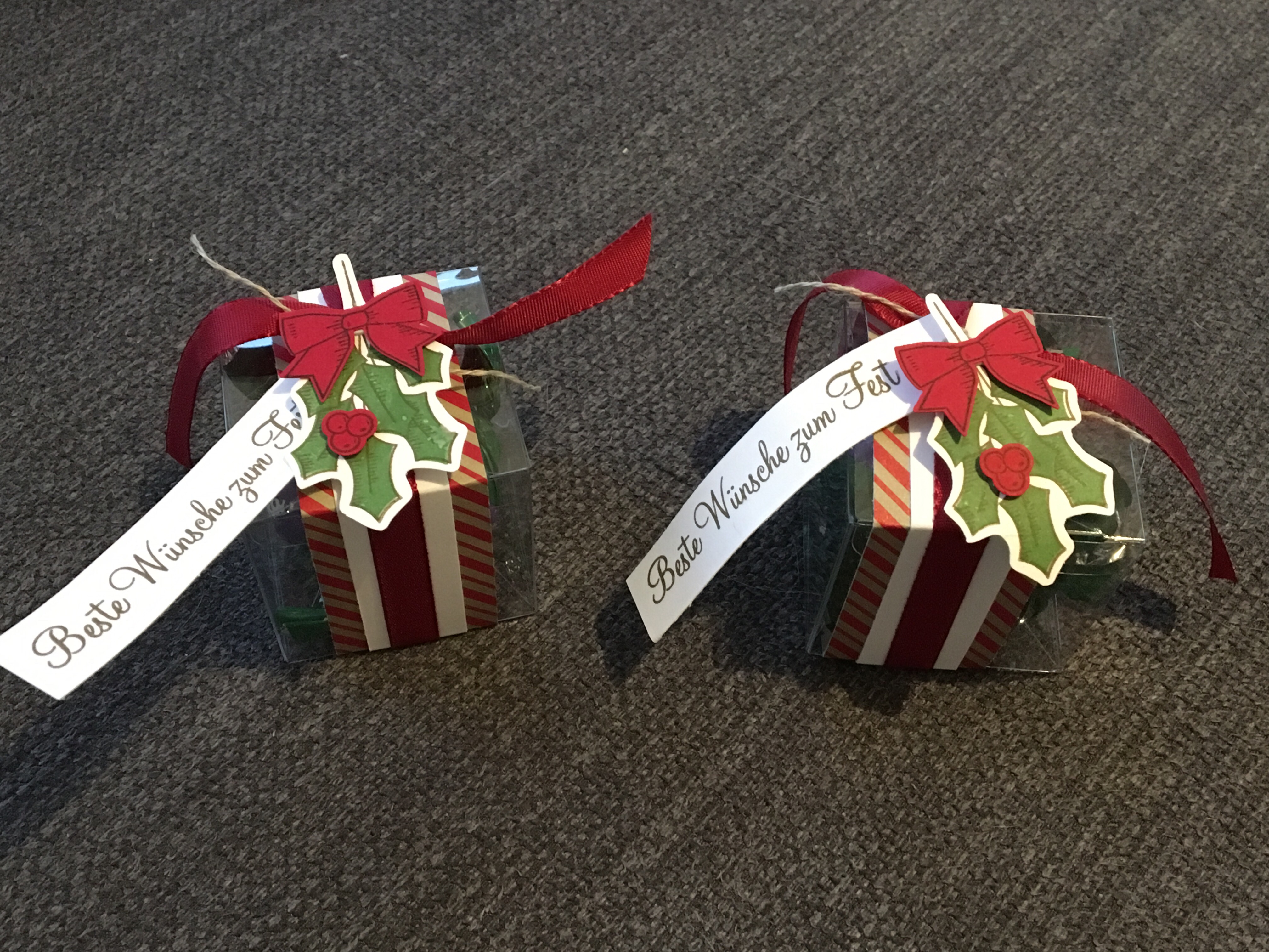 Hergestellt sind sie aus den Mini Klarsicht Schachteln aus dem Jahreshauptkatalog. Diese sind mit einer Banderole aus dem Designerpapier Zuckerstangenzauber und einer weiteren in Flüsterweiß umschlossen, auf die ich eine Schleife aus dem Geschenkband in Chili gesetzt habe. So entsteht dieser Weihnachtliche Streifenstil. Verziert habe ich das Päckchen mit einem Stück Leinenfaden, an dem das Grußschildchen hängt, und dem Mistelzweig aus dem Stempelset Adventsgrün. Der Gruß ist in Wildleder, die Misteln in Gartengrün gestempelt. Die Glutrote Schleife und die Beeren habe ich mit der dazu passenden Stanze ausgestochen und das ganze mit Dimensionales befestigt.