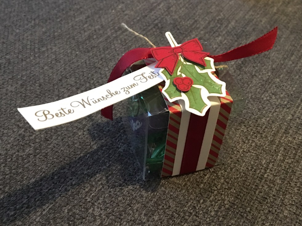 Hergestellt sind sie aus den Mini Klarsicht Schachteln aus dem Jahreshauptkatalog. Diese sind mit einer Banderole aus dem Designerpapier Zuckerstangenzauber und einer weiteren in Flüsterweiß umschlossen, auf die ich eine Schleife aus dem Geschenkband in Chili gesetzt habe. So entsteht dieser Weihnachtliche Streifenstil. Verziert habe ich das Päckchen mit einem Stück Leinenfaden, an dem das Grußschildchen hängt, und dem Mistelzweig aus dem Stempelset Adventsgrün. Der Gruß ist in Wildleder, die Misteln in Gartengrün gestempelt. Die Glutrote Schleife und die Beeren habe ich mit der dazu passenden Stanze ausgestochen und das ganze mit Dimensionales befestigt.