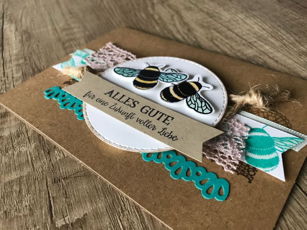 Ich habe meinen Lieblingsstempel, die Hummel aus den Li(e)belleien benutzt, der Spruch kommt aus einem Set, dass ihr euch unbedingt anschauen solltet, es heißt Doppelt gemoppelt und hat für jeden Anlass das passende im Gepäck! Mit jeweils zwei Sprüchen, die typografisch genau aufeinander abgestimmt sind, falls ihr zwei braucht, die aber auch toll alleine funktionieren. Dazu kommen Zierelemente, die man auf den Fotos nicht sieht, weil ich sie Innen in die Karte gestempelt habt. Aber es gibt da ein Herz zwischen zwei Pfeilen, das einfach großartig ist ❤ Ich habe in Bermudablau und Aquamarin das eigene Designerpapier aus Hummelbienen gestempelt, was ihr im Hintergrund seht. Die Framelits Stickmuster waren mit von der Partie und zu guter Letzt die Stanze Bordüre unten in Bermudablau. Der kleine Farbunterschied der beiden Hummeln kommt daher, dass ich für die eine unsere Aquarellstifte in Bermudablau und Osterglocke und für die andere das Safrangelbe und Aquamarinfarbene Stempelkissen benutzt habe. Aber außer mir und euch Eingeweihten sieht das wahrscheinlich eh kein Mensch. 😉