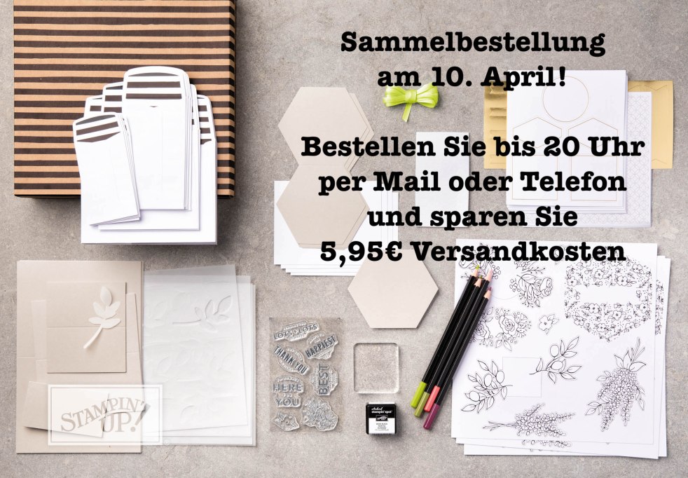 Die Sammelbestellung hat für euch nur Vorteile! Ihr bestellt gemeinsam mit Kundinnen aus der Umgebung und spart die 5,95€ Versandkosten, die ihr sonst für jede Bestellung bei Stampin‘ Up! zahlen würdet. Die bestellte Ware wird zu mir nach Hause geliefert und Sie können Sie sich, sobald sie eingetroffen ist,