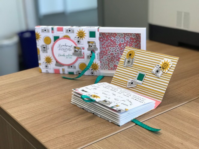 Ich habe nur die Front und den Verschluss etwas anders gestaltet, die Farben Flamingorot und Smaragdgrün aus dem Papier übernommen und die Verpackung wie einen Schokoladenaufzug verschlossen. Innen in das Album sind Polaroids meiner lieben KollegInnen eingeklebt und dekoriert sind sie mit den ausgeschnittenen Kameras und Filmen aus dem Papier, mehr braucht es nicht!