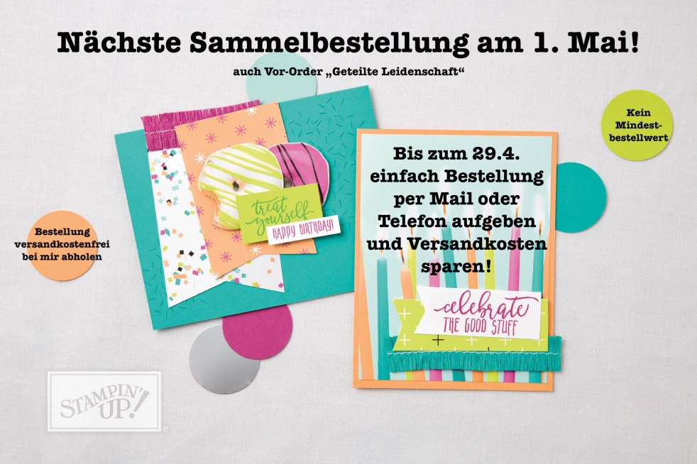 ich freue mich, euch meine nächste Sammelbestellung ankündigen zu dürfen, sie wird am 1. Mai stattfinden, damit ihr sowohl am Ausverkauf aus dem aktuellen Katalog als auch an der Vorabaktion ‚Geteilte Leidenschaft‘ teilnehmen könnt! 🙂