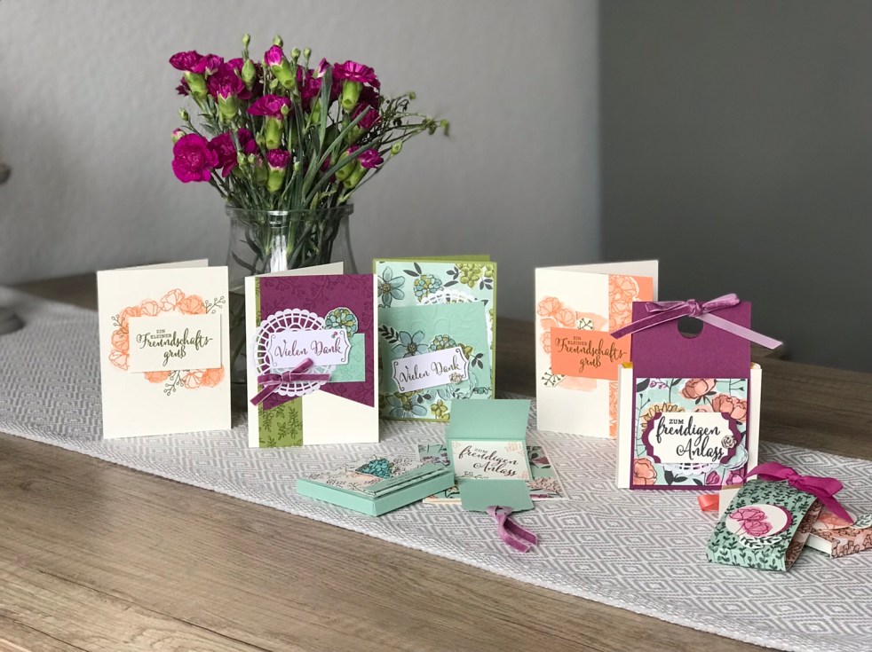 Hier zwei Karten, die schon mit dem Set „Erste Schritte“ gestaltet werden können, das Set ist für Anfängerinnen gedacht, deswegen hat es auch noch einen Stempelblock zur Grundausstattung und als einziges zwei Stempelkissen: Grapefruit und Olivgrün.