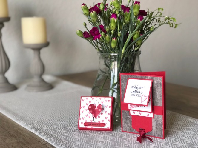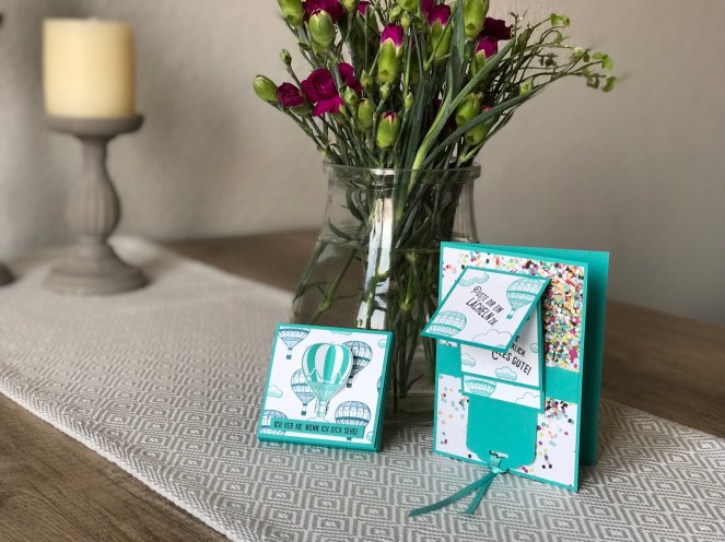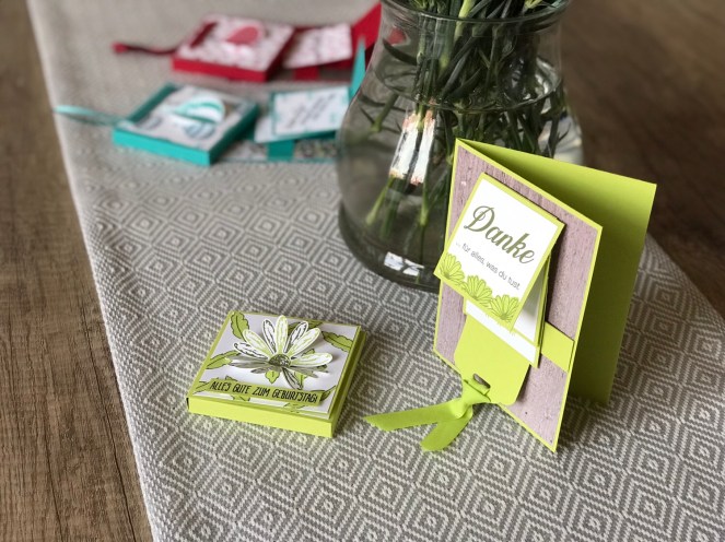 Ich habe meien Vororder aus dem neuen Katalog damit verbastelt und bin immer noch ganz begeistert von den Produktpaketen der Aktion ‚Geteilte Leidenschaft‘. Das Designerpapier bringt mich einfach völlig ins Schwärmen 😉 Deswegen habe ich es auch für den zweiten Teil des Geschenksets benutzt, eine Wasserfallkarte, die ich euch dann am langen Wochenende zeigen werde! 🙂