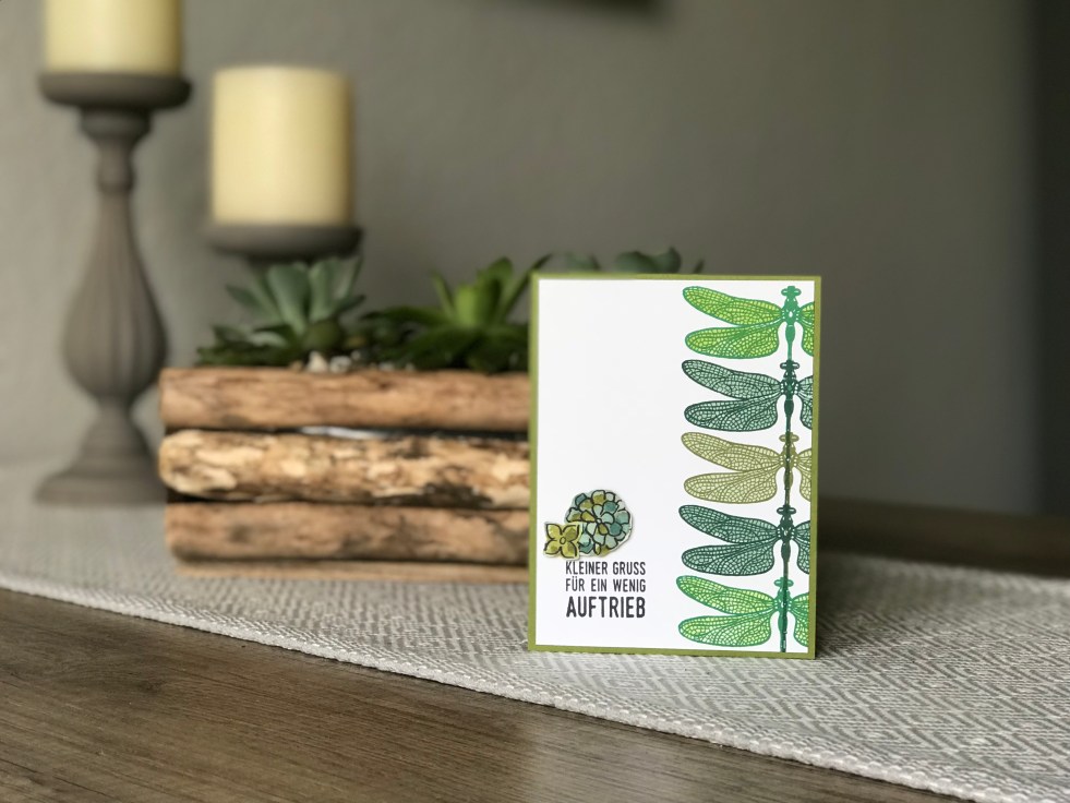 In meinem Video benutze und erkläre ich die von mir so getaufte Scharnier-Technik 🙂 Diese Technik habe ich mithilfe eines offiziellen Stampin‘ Up! Videos gelernt, aber wir brauchen diese Videos auf Deutsch, deswegen habe ich eins für euch abgedreht. Ich zeige euch, wie ich die Libellenkarte ganz in grün gebastelt habe. Ich liebe die neuen Grüntöne aus dem neuen Katalog, ich habe bei dieser Karte drei neue Lieblinge ausprobiert: Kleegrün, Lindgrün und Minzmakrone! Einfach klasse!