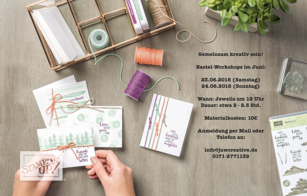 Ich kündige euch hiermit zwei Workshops im Juni an. Wir ein Set aus Kullerkarte und Pillowbox mit den brandneuen Produkten aus dem neuen Jahreshauptkatalog basteln! Es sind jeweils noch zwei Plätze frei, also schnell sein und einfach per Mail oder Telefon anmelden!