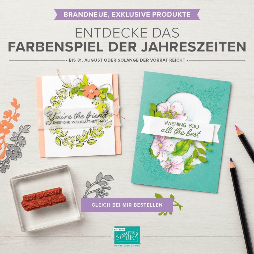 Farbenspiel der Jahreszeiten ist ein Paket, was wie der Name schon sagt, große Motive für das ganz Jahr enthält. Frühling bis Winter sind in dem Set durch große Motiv vetreten. Ihr habt die unterschiedlichsten Sprüche, mit denen ihr spielen könnte und das Beste: Ein Framelitsset mit Stickereien… Bestickt durchs Jahr: ein Traum! Vor allem, weil das Stickmuster nicht nur innen auf dem ausgestanzten Teil, sondern auch außen auf dem Rahmen zu sehen ist. Einfach toll! Und wer glaubt, dass das schon alles war, liegt daneben. Wir haben ab dem 1.8. auch ein völlig neues Set der Aquarellstifte in unseren neuen Farben im Sortiment! Unten seht ihr ein paar Produktbeispiele!