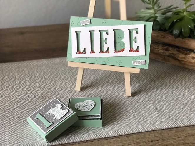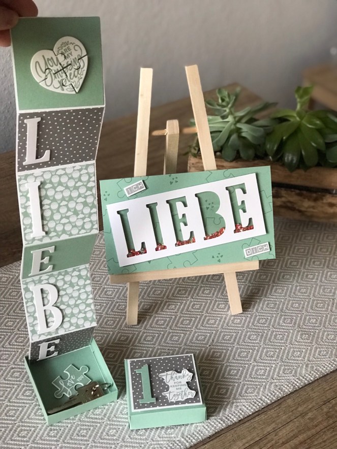 auch Demonstratorinnen haben Produkte auf der langen Wunschliste stehen, das kann ich euch sagen. Wir sind nicht anders als unsere Kundinnen – wir sind wahrscheinlich sogar schlimmer! Einen Wunsch von meiner Liste konnte ich mir Dank euch vorigen Monat erfüllen: Die Framelits „Große Buchstaben“! Ich zeige euch heute mein erstes Projekt mit Ihnen, eine Schüttelkarte und ein Mini-Leporello in der Box, das ich meinem Freund zum Jahrestag geschenkt habe.