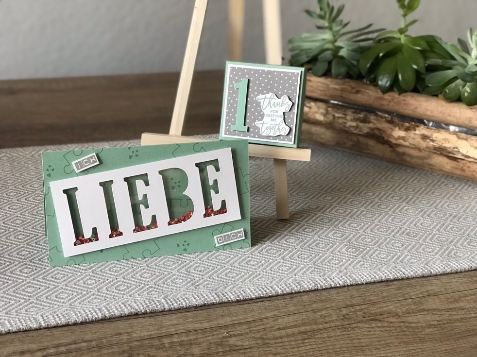 auch Demonstratorinnen haben Produkte auf der langen Wunschliste stehen, das kann ich euch sagen. Wir sind nicht anders als unsere Kundinnen – wir sind wahrscheinlich sogar schlimmer! Einen Wunsch von meiner Liste konnte ich mir Dank euch vorigen Monat erfüllen: Die Framelits „Große Buchstaben“! Ich zeige euch heute mein erstes Projekt mit Ihnen, eine Schüttelkarte und ein Mini-Leporello in der Box, das ich meinem Freund zum Jahrestag geschenkt habe.