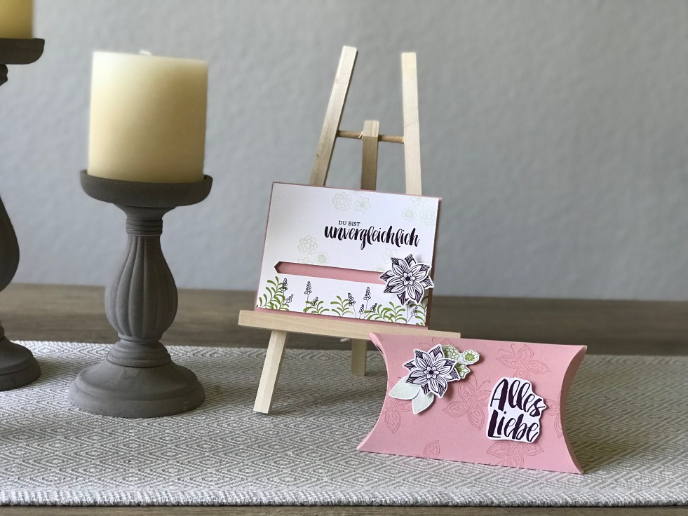 Heute fangen wir mit der Pillowbox an, die ich in Rosa und Grüntönen gestaltet habe. Weitere Beispiele für Farben und Stampelsets seht ihr auf den Fotos unten und auch im Video. Ich finde, das tollste an meinen Bastelworkshops ist eigentlich, dass bei immer der gleichen Anleitung so viele unterschiedliche Projekte entstehen, die oft genau zu ihren UrheberInnen passen. Jeder gibt dem Projekt eine ganz persönliche Note, so soll Handgemachtes auch einfach sein 🙂 Es macht mir immer viel Spaß mit euch!