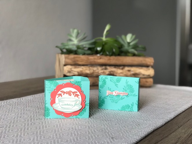 Der Rest der Stempel kommt aus dem Set Teepause, der Spruch auf der Rückseite des Buches in Calypso, die Tasse in Jade auf Vanille, die Teeblätter oben sind mit ebenfalls Calypso gestempelt. Der Innenteil wurde vorher einmal abgestempelt, damit er etwas heller ist. Das Zierdeckchen, was ich ganz niedlich finde, ist in zwei größen in den Framelits Teepause enthalten, dieses hier ist das größere von beiden.