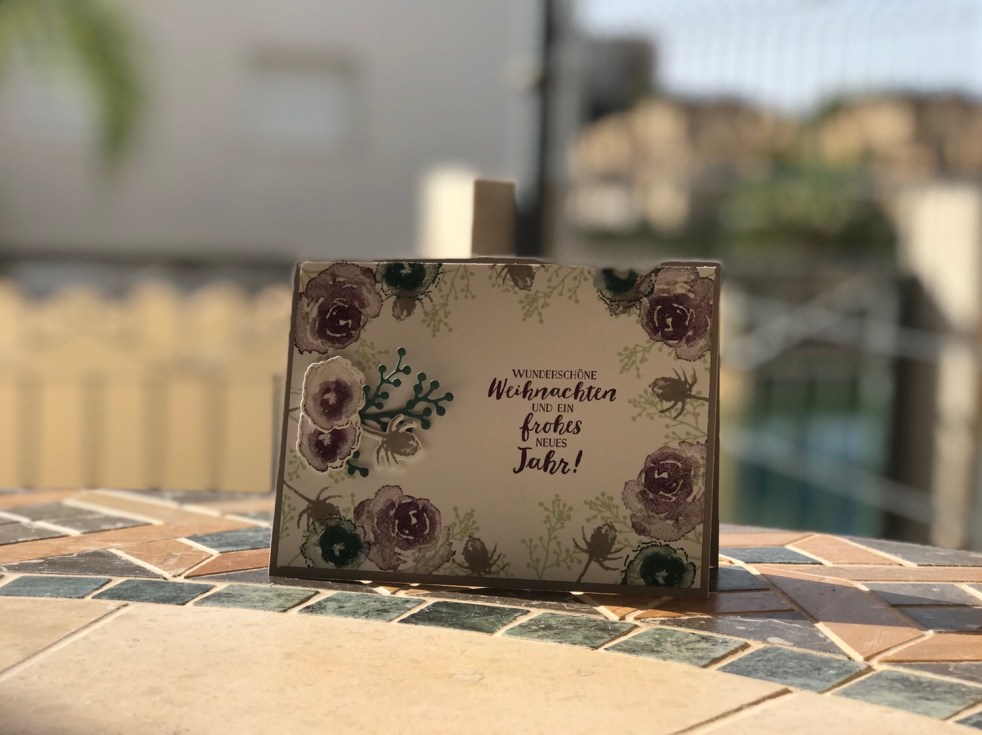 Ich habe die Grundkarte in Granit gestaltet und die flüsterweiße Auflegekarte mit den Zweigen, der Distel und den großen und kleinen Rosen in Lindgrün, Granit, Brombeermousse und Meeresgrün rundherum gestempelt. Das gab einen super schönen Hintergrund, den ich nur noch etwas dreidimensional dekoriert habe, mit einem Zweig in Meeresgrün, einer Distel in Granit und zwei kleinen Röschen in Brombeermousse und ein paar Dimensionals war das fix erledigt. Nur noch der Spruch in Brombeermousse drauf und fertig 🙂