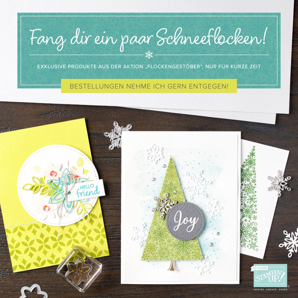 im November, passend zur Vorweihnachtszeit, wenn die ersten Weihnachtskarten gebastelt werden, hat Stampin‘ Up! eine tolle Überraschung für uns. Das exklusiv erhältliche Produktpaket Flockengestöber 🙂