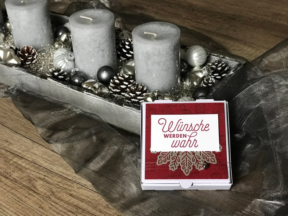 Am dritten Tag Weihnachtsprojekte zeige ich euch eine ganz schnelle Last-Minute-Idee mit unseren Pizzaschachteln aus dem Jahreshauptkatalog. Dazu habe ich ein Stückchen Farbkarton in Chili mit den Geschenkschachteln aus der Weihnachtswerkstatt Ton in Ton bestempelt. Darauf habe ich eine große Schneeflocke in Silber geklebt, die es letztes Jahr im Herbst-/Winter Katalog gab. Aber keine Angst, wer in der Aktion Flockengestöber die große Schneeflocke ergattern konnte, hat ab jetzt einen tollen Ersatz im Bastelregal!