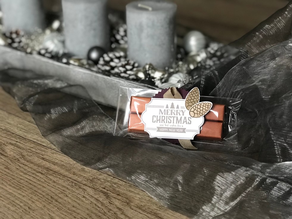 Der siebte Tag meiner Weihnachtsideen zeigt euch, wie man bereits vorhandene Designs weiterverwerten und für ein anderes Projekt in neuem Glanz erscheinen lassen kann. Ich habe euch mein Projekt schon für die Geschenkanhänger gezeigt. Wenn ihr den Beitrag verpasst habt, dann klickt einfach hier. Aber weil mir Brombeermousse in Kombination mit den Tannenzapfen aus „Making everyday bright“ so gut gefallen hat, habe ich sie auf einer Verpackung für zwei Schokoriegel ausprobiert.