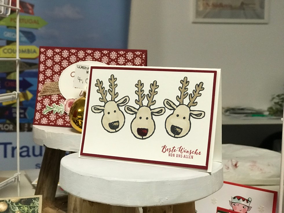 Spaß beiseite, dieses hübsche Kärtchen habe ich zur Weihnachtszeit zu diesem Thema angefertigt, dafür war ich einmal faul und habe die fertigen Karten und Umschläge in Flüsterweiß benutzt, die ihr im Jahreshauptkatalog findet. Darauf befindet sich eine Stück Farbkarton in Chili, auf dem die Auflegekarte in Flüsterweiß klebt. Ich habe die drei Rentiere aus dem Set „Ausgestochen Weihnachtlich“ in Smoking Schwarz gestempelt und sie mit den Stampin‘ Blends in Savanne (hell und dunkel) und Chili koloriert. Der Spruch, den ich in Chili gestempelt habe, kommt aus den „Klitzekleinen Grüßen“.