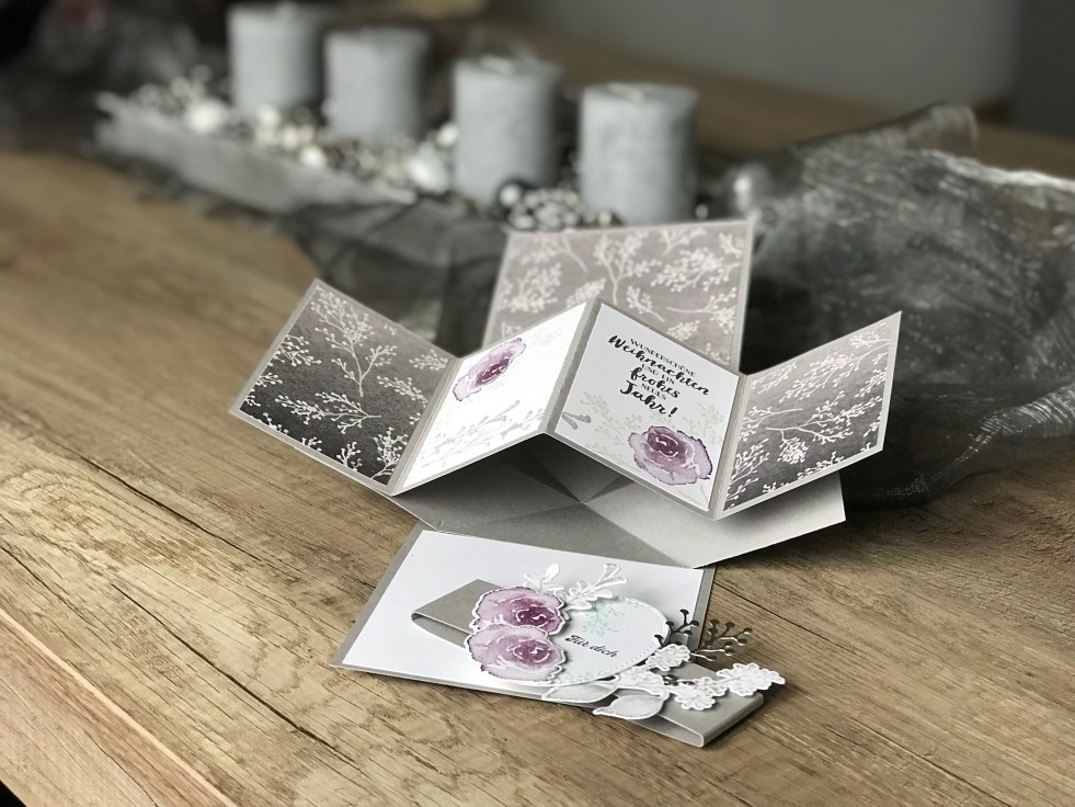 Am letzten Tag der Weihnacht zeige ich euch eins meiner absoluten Liebnlingsprojekte in diesem Jahr, dass ich an meinen ehemaligen Chef verschenkt habe: Eine edle Pop-Up-Panel-Karte! Dieses hübsche Kärtchen habe ich mit dem Designerpapier Winterblüten gestaltet und das Stempelset Eisblüten und die passenden Framelits – oder waren die Namen andersherum? – komplett ausgenutzt. Als Abschlussprojekt des diesjährigen Winterkatalogs feiere ich dieses hübsche Papier noch einmal ganz besonders.