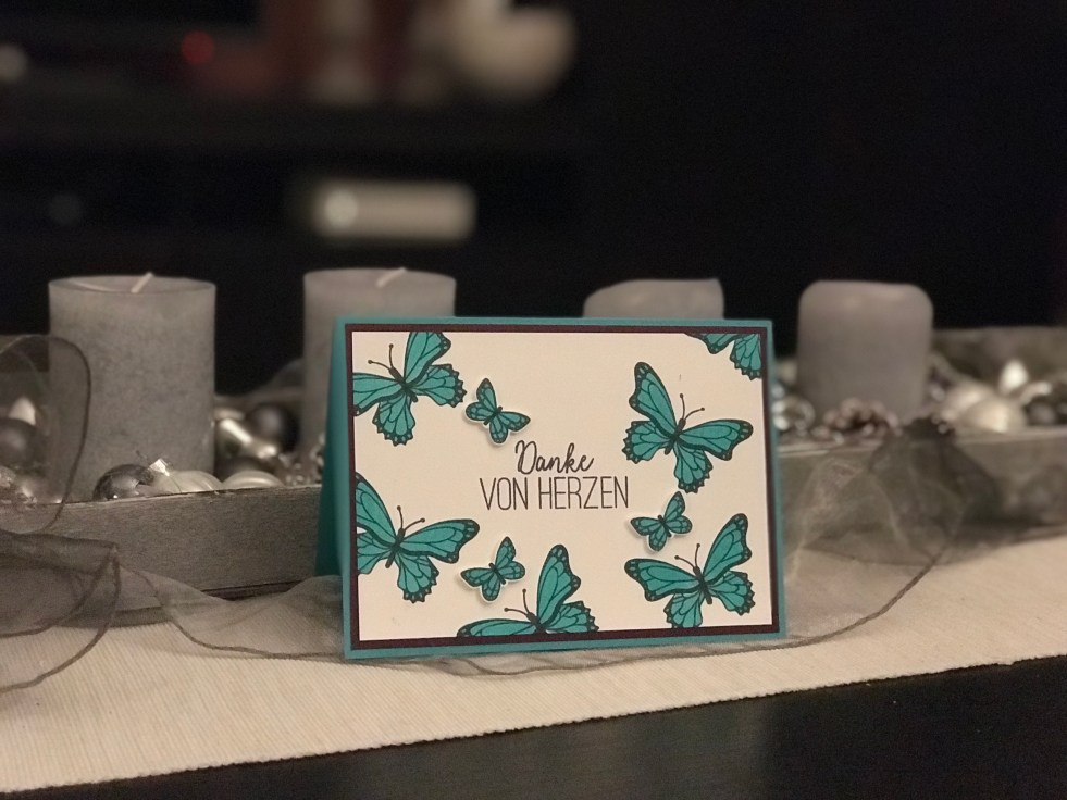 Die Grundkarte ist Bermudablau, darauf klebt eine weiße Auflegekarte, die ich mit Farbkarton in Brombeermousse hinterlegt habe. Der Spruch kommt aus einem hübschen Schmetterlingsset, das wir neu im Sortiment haben! Ich habe ihn als allererstes in schwarz auf die Karte gestempelt. Einfach mittenrein, damit er im Zentrum der Karte steht. Nicht nur wörtlich, sondern auch im übertragenden Sinne 😉 Ebenso die Schmetterlinge in groß und klein befinden sich (auf einem Stempel) im Set „Schmetterlingsglück“. Das hat folgenden Grund: Es gibt eine passende Handstanze „Schmetterlingsduett“ im Bundle dazu, die sie gleichzeitig ausstanzt. Um die großen Schmetterlinge jetzt aber kreuz und quer auf der weißen Karte zu verteilen, habe ich den Stempel nicht auseinander geschnitten, sondern mit dem Memento Stempelkissen nur den oberen Teil des Stempels schwarz eingefärbt. Wer auf Nummer sicher gehen will, klebt den Rest des Stempels mit einem Post-It ab, es geht aber auch ohne 🙂 Ihr könnt die Flügel der Schmetterlinge mit diesem tollen Set ganz unterschiedlich einfärben, zum Füllen habt ihr das obere und untere Flügelpaar nämlich separat im Set drin. Ich habe als bekennende Ton-in-Ton-Tante in Bermudablau gestempelt und so hübsche blaue Morphos gestaltet – meine absoluten Lieblingsschmetterlinge.