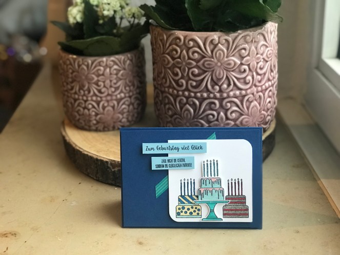 heute zeige ich euch eine Geburtstagskarte, die ich am vergangenen Wochenende meinem Vater zu seinem 55. geschenkt habe. Männerkarten sind ja immer etwas komplizierter. wir haben so viele verspielte und geblümte Muster, die vielleicht nicht unbedingt zum Beschenkten passen und auf der anderen Seite die etwas klischeehaften Werkzeugsets (psst, da ist nur meine Meinung 😉 ). Aber ich glaube, dass wir im Stempelset „Kuchen ist die Antwort“ mit der dazu passenden Handstanze etwas tolles an die Hand bekommen haben, um schöne Karten für Menschen zu gestalten, die es auch etwas weniger verspielt mögen.