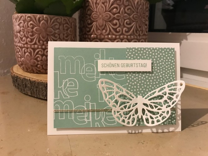 Dekoriert habe ich den Farbkarton mit einem Stück Designerpapier Pastellfarben in Minzmakrone und einem Stück Leinenfaden, den ich einfach um den Karton gewickelt und auf der Rückseite an den Dimensionals befestigt habe, die auch den Farbkarton auf der weißen Grundkarte halten. Ich habe mit dem Stempelset ‚Glücksfälle‘ einen ‚Schönen geburtstag‘ in Minzmakrone auf Flüsterweiß gestempelt und mit Dimensionals befestigt. Der Schmetterling aus den Thinlits Gartenimpressionen in Flüsterweiß lugt ein wenig über beide Seiten des Designerpapiers 🙂