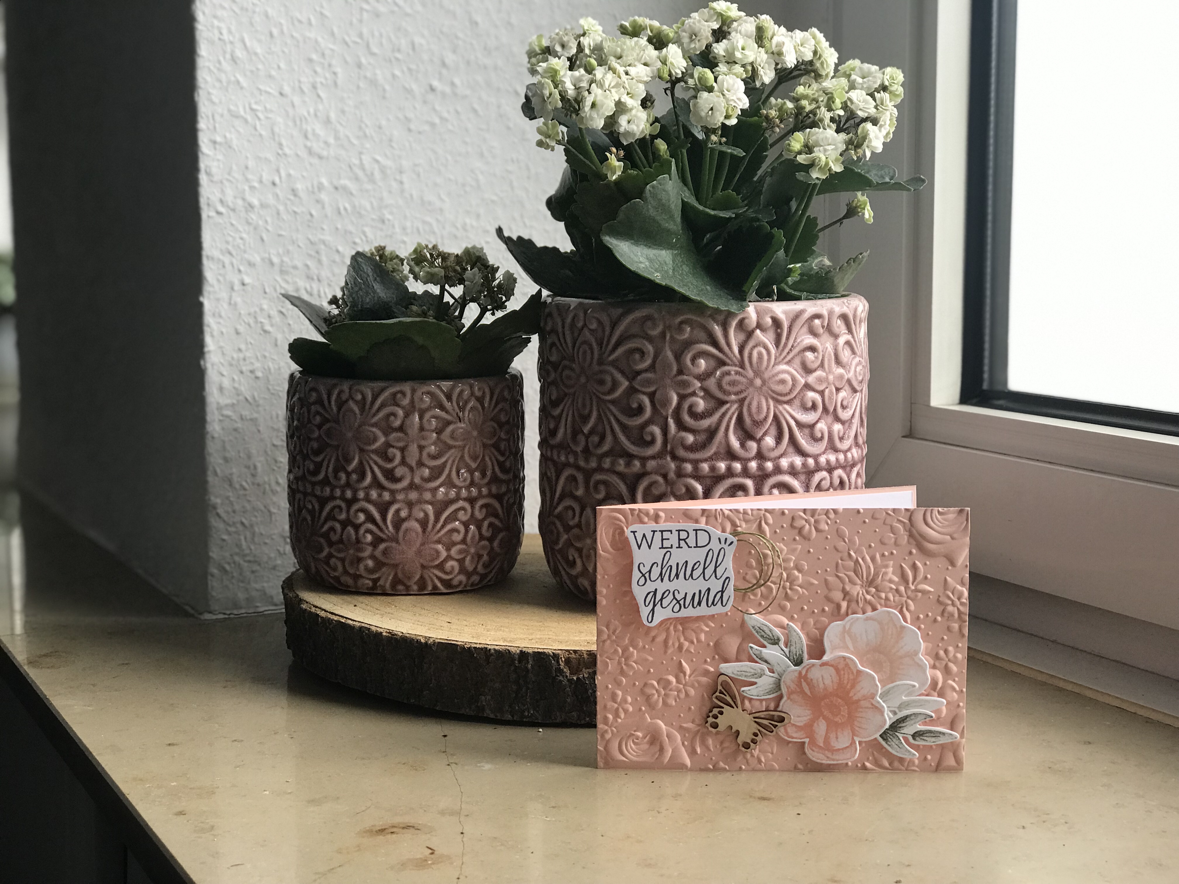 Dieses Kärtchen in Blütenrosa habe ich mit dieser Prägeform gestaltet, indem ich einfach die Vorderseite der Karte in der Form durch die Maschine gekurbelt habe. Wenn ihr das Muster noch ein bisschen intensiver möchtet, dann empfehle ich euch, das Papier vorher mit etwas Wasser und dem Stampin‘ Spritzer zu befeuchten. Es ist aber nicht zwingend notwendig, um ein schönes Ergebnis zu bekommen 🙂 Der Spruch, den ich mit einem Stück von unserem Olivgrünen Leinenfaden aus dem Frühjahr/Sommerkatalog hinterlegt habe, kommt aus dem Stempelset Genesungswünsche. Ihr erinnert euch an das letzte Kärtchen? tatsächlich fälllt mir während des Schreibens gerade auf, dass ich außer dem Spruch, dem Farbkarton und dem Spruch nur Sale-A-Bration Produkte verwendet habe.
