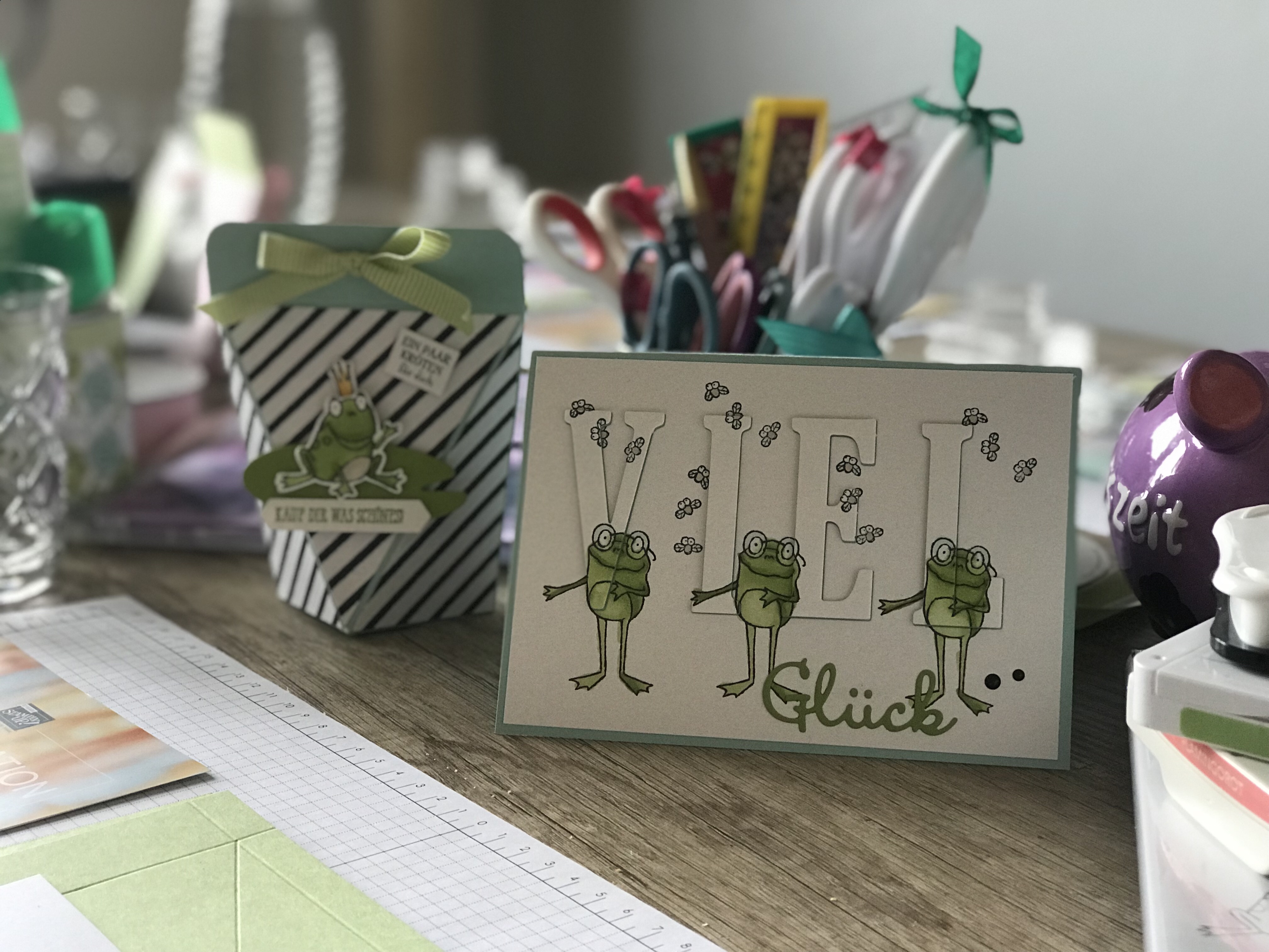 Verpackung und Grundkarte sind im Aquamarin gestaltet, für die Karte habe ich eine besondere Technik ausprobiert, die ‚Floating Letters‘ heißt und mit den Framelits ‚Große Buchstaben‘ ganz phantastisch funktioniert. Dazu bestempelt ihr zuerst eure Auflegekarte: Meine ist Flüsterweiß mit den bebrillten Fröschen und den kleinen Fliegen in Memento gestempelt und mit den Blends in Grüner Apfel, Aquamarin und Savanne koloriert. Diese Grundkarte kurbelt ihr euch dann mithilfe der Magnetplatte so durch die Big Shot, dass die großen Buchstaben euer Wort in die Grundkarte stanzen. Und ja – das ist völlig korrekt so 😉 Die Buchstaben werden dann mit unseren Mini Dimensionals wieder genau an die Stelle geklebt, die ihr vorher ausgeschnitten habt und fertig ist der tolle 3D Effekt der schwebenden Buchstaben. In meinem Fall habe ich mit den Stanzformen ‚Schön geschrieben‘ meinen Spruch komplettiert und so ein dezentes Viel Glück auf die Karte gesetzt.