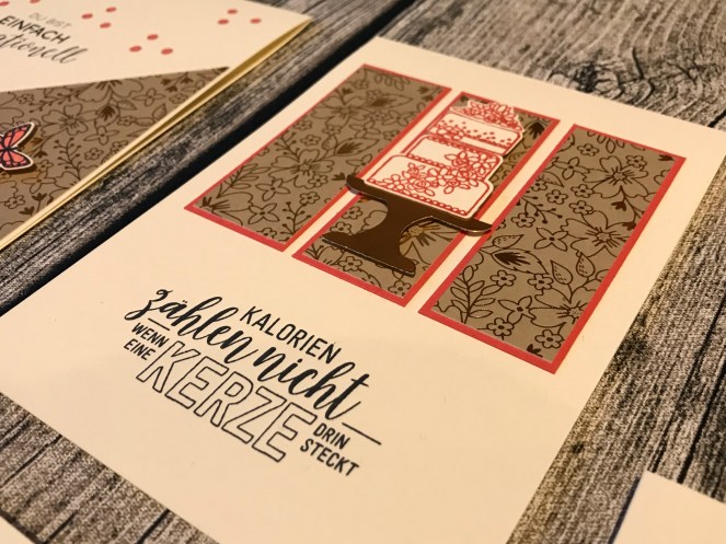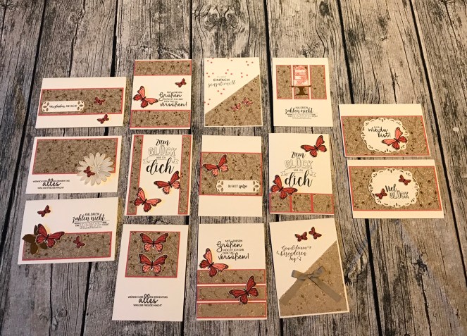 Dieses Papier war ein besonderes Designerpapier, das einen Kupferfarbenen Schimmer hatte, ich hoffe, so etwas kommt bald mal wieder, denn es ist auf diese Weise schon so ein Hingucker, dass meine Karten nicht mehr viel Deko brauchten. Ich habe dafür mit den Stempelsets Schmetterlingsglück, Gänseblümchenglück, Kuchen ist die Antwort, Bestickte Grüße, Glücksfälle und alles, was glücklich macht, gearbeitet. Die Sprüche sind zum Großteil mit Memento schwarz direkt auf die Karte gestempelt. Gemattet sind fast alle Designerpapierstücke mit Farbkarton in Melonensorbet.