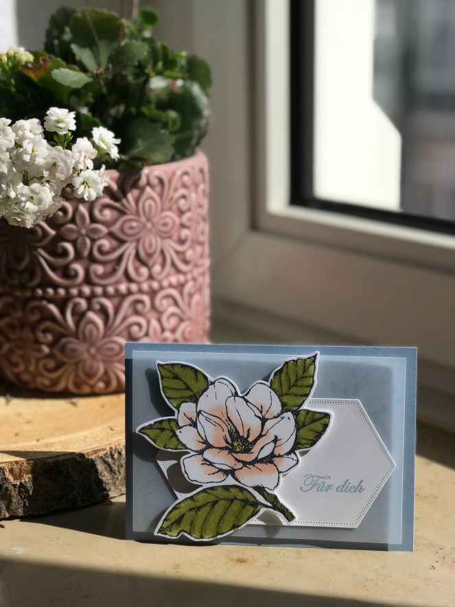Rechts unten habe ich ein neutrales „für dich“ in Rauchblau gestempelt und die große Magnolie mit Dimensionals aufgeklebt. Manchmal ist weniger mehr 🙂