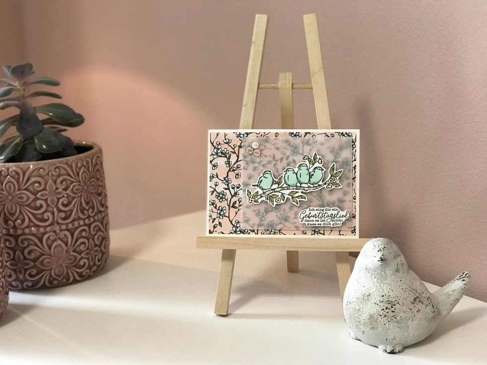 Die Geburtstagskarte, die ich damit gestaltet habe, ist recht simpel gemacht. Ich habe aber vor kurzem unseren transparenten Farbkarton für mich entdeckt und bin total begeistert, wie er in Kombination mit einem schönen Designerpapier wirkt. Zum Beispiel das Designerpapier Vogelgarten, das super schön ist, hat dieses Ranken- und Blütenmuster auf Kirschblüte, dass ich einfach nur auf eine weiße Grundkarte geklebt habe. Das trickige am Transparenten Farbkarton ist, dass er durchsichtig ist und man deshalb nicht sonderlich gut Flüssigkleber darunter verstecken kann 😉 Wenn ihr also die Karte Nachbasteln oder ein ähnliches Projekt auf dem Tisch habt, kommt hier mein Tipp: Gestaltet zuerst den Teil, der später draufkommen soll 🙂 in meinem Fall waren es die Vögel auf dem Ast, die ich in Memento schwarz gestempelt und mit den Blends in aquamarin, Savanne, Olivgrün, Blütenrosa und Osterglocke koloriert und dann mit der Papierschere ausgeschnitten habe.