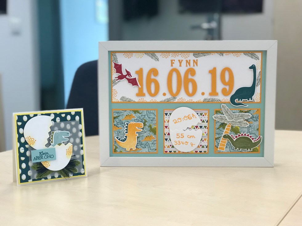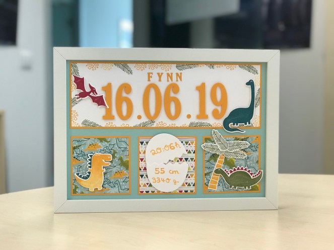 Die unteren drei Felder sind mit dem Designerpapier „Im Dino-Land“ beklebt – für jeden Fan dieser Tierchen ist das Papier ein absolutes MUSS, ich kann es nicht anders sagen, es ist einfach unglaublich schön und detailliert. Ich liebe es! 😀 Darauf kleben mit etwas Abstant links ein Mangogelber T-Rex mit Pfauengrünen Zacken und rechts ein Olivgrüner Saurier mit Kussroten Zacken, bei dem ich keine Ahnung habe, welcher Art er ist. Der kleine grüne eben 😉 Neben ihm steht eine Mangogelbe Palme mit Olivgrünen Blättern. In der Mitte habe ich ein Dino-Ei auf Flüsterweißem Farbkarton gebastelt, das ebenfalls in den Framelits „Dinos“ enthalten ist. Darauf habe ich mit meinem Stampin‘ Write Marker in Mangogelb Gewicht, Größe und Uhrzeit der Geburt notiert. Ausnahmsweise handschriftlich, das ist aber auch mit jedem Alphabet, das wir im Programm haben, ohne weiteres möglich.