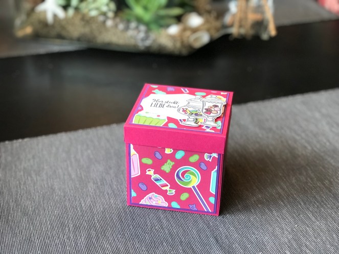 Kennt ihr das? Manchmal seht ihr ein Produkt und wisst genau zu wem sie passen wie der Deckel zum Kochtopf 😉 Im letzten Frühjahrskatalog hatten wir eine wunderbare Produktreihe, die Bonbonglas hieß, ein poppig buntes Designerpapier und ein sehr hübsches Stempelset habe ich am Wochenende noch einmal herausgekramt, um einer lieben Freundin ein hübsches Geburtstagsgeschenk zu zaubern 😊