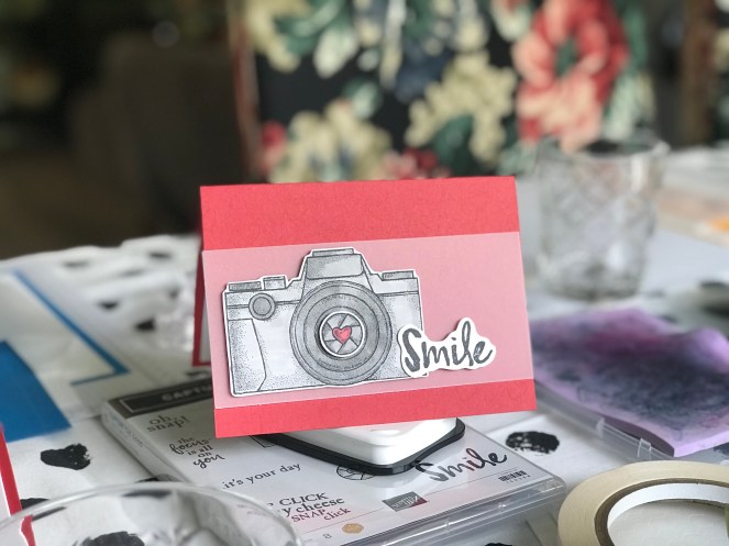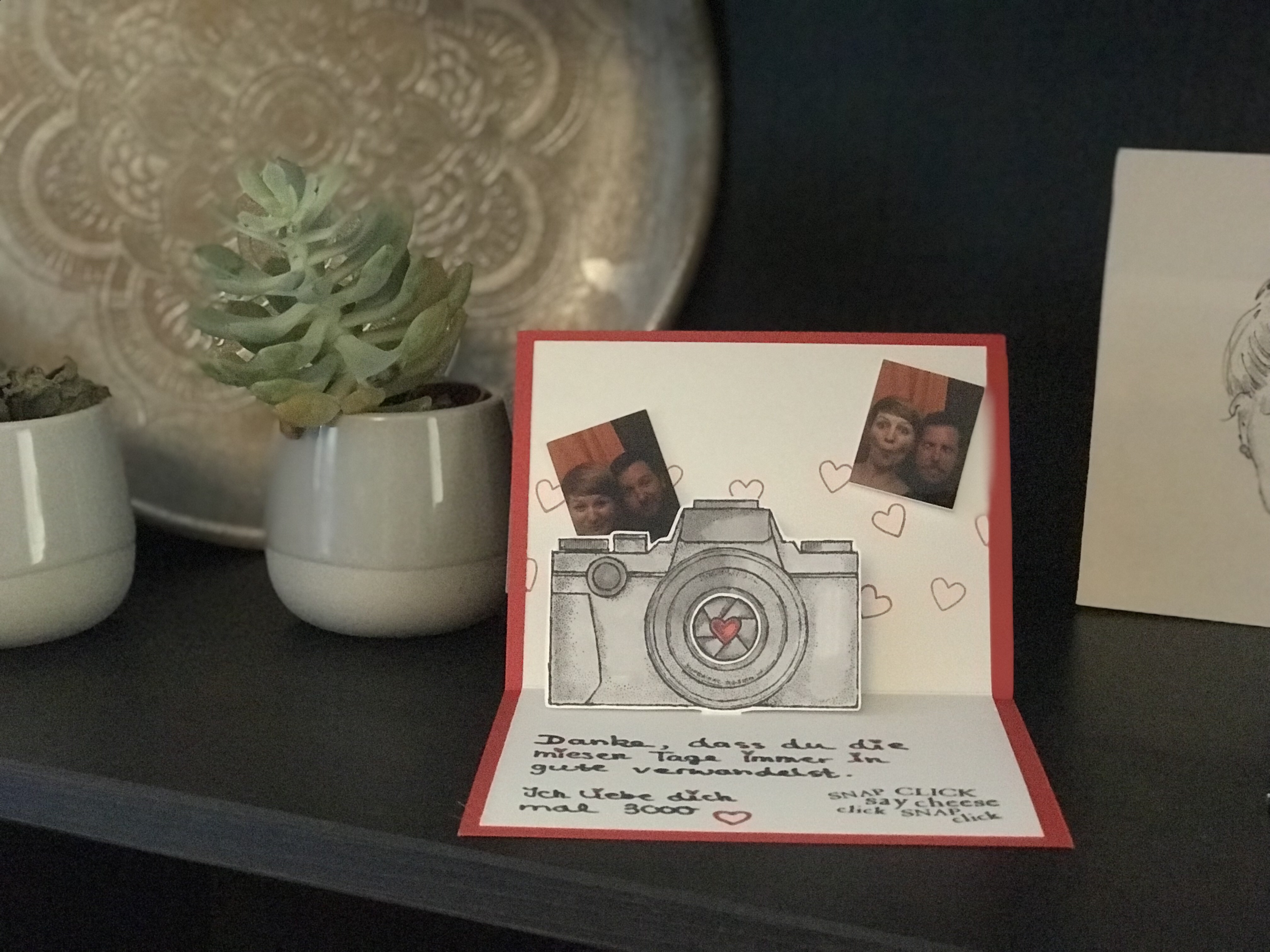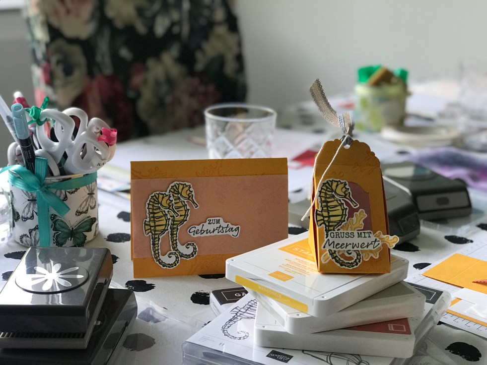 Die passende Karte dazu ist beim Workshop verloren gegangen, ich habe sie leider nicht mehr, aber ein Foto von der Außenseite habe ich glücklicherweise vorher noch machen können. Sie ist mit den gleichen Materialien entstanden, die Koralle ist hier auch der Hintergrund der Mangogelben Grundkarte. Darauf klebt ein Stück Pergament Farbkarton, der einen hübschen Schatten auf das Projekt wirft und zwei Seepferdchen und der neutrale Spruch ‚zum Geburtstag‘ runden das schlichte Außenergebnis ab. Die Karte ist ein Popupkarte, wie ich sie euch schon einmal in einem anderen Beitrag gezeigt habe, ihr müsst euch die Innenseite jetzt leider denken, ich zeige euch noch die restlichen Karten hinterher, damit ihr die Technik sehen könnt 🙂