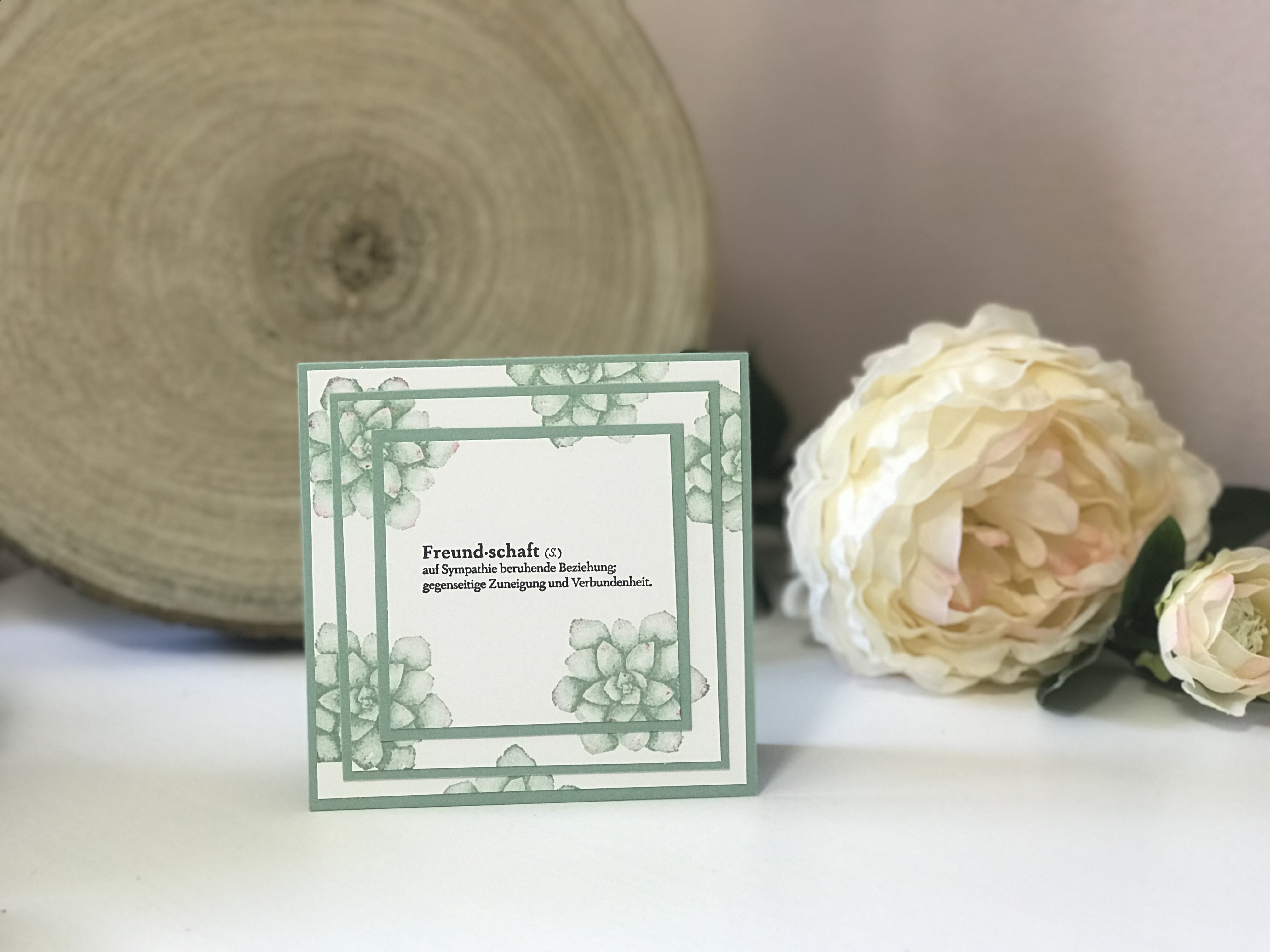 Als Spruch in der Mitte habe ich einen Stempel aus dem Set „Gut definiert“ ausgesucht. Liebe gibt es zwar nicht, dafür aber Freundschaft. Und was gibt es schöneres als eine Karte für einen guten Freund, mit dem man ihm seine Zuneigung zeigt 🙂