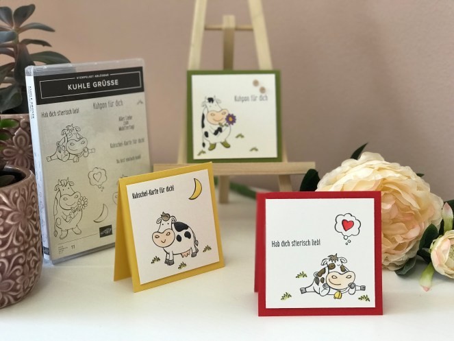 Ihr habt richtig gehört, für diese drei kleinen Grüße mit viel Herz und viel Muh braucht ihr gar nicht viel. Das Stempelset ‚Kuhle Grüße‘ ist ein Basic, dass ihr für viele tolle Anlässe einspannen könnt, ich habe euch nur drei davon gezeigt: Als Gutscheinkarte, zum Muttertag oder als Gruß für den Lieblingsmenschen 😉