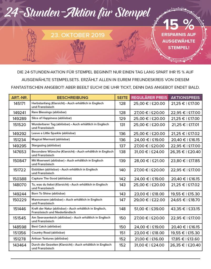 meine nächste Sammelbestellung findet am 23.10. statt! Warum? Weil ihr euch an diesem Tag für nur 24 Stunden Rabatte auf ausgewählte Stempel von Stampin‘ Up! sichern könnt, Hammer oder?