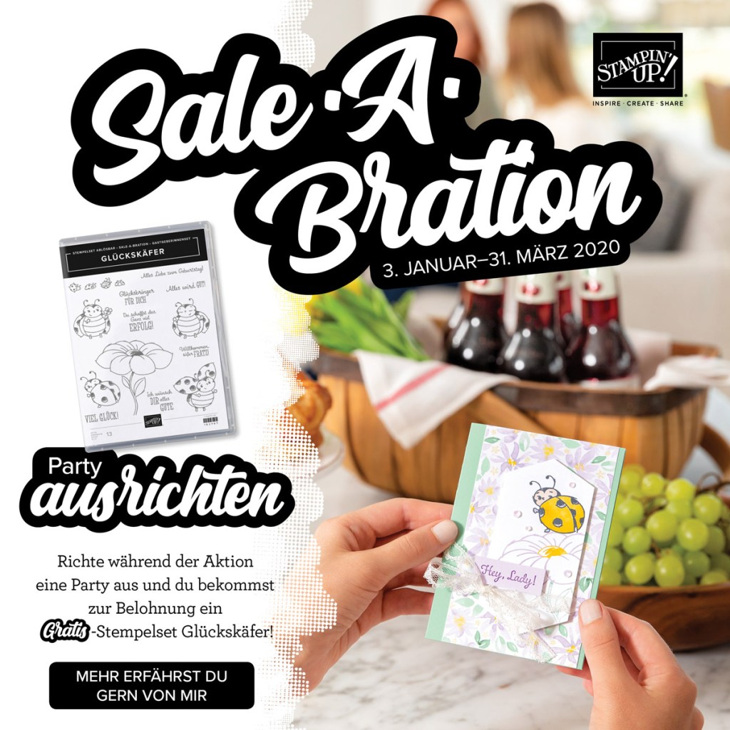 Weil es dafür tolle Prämien gibt! Sobald du Gastgeberin bei der Sale-A-Bration bist, bekommst du das super süße Stempelset „Glückskäfer“ gratis dazu, sobald die Gesamtbestellung der Party bei 375€ liegt.