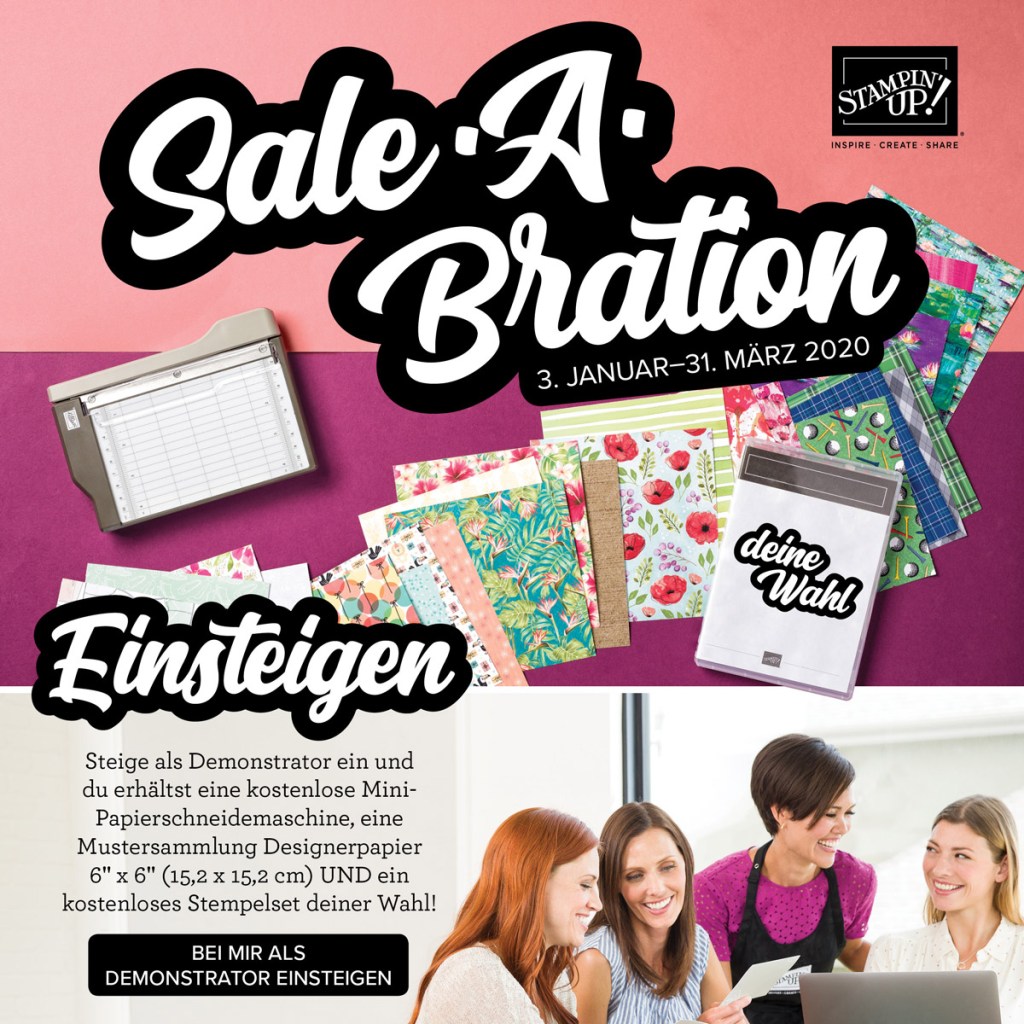 Die Sale-A-Bration ist die beste Zeit im gesamten Stampin‘ Up! Jahr – das unterschreibe ich gerne jederzeit mit GROSSBUCHSTABEN 🙂 Denn diese Aktion ist wirklich für jeden etwas – egal, ob du gerade anfängst mit dem Bastelhobby, du eine leidenschaftliche Stampin‘ Up! Kundin bei mir bist, oder überlegst, selber dauerhaft bei deinen Stampin‘ Up! Produkten zu sparen.