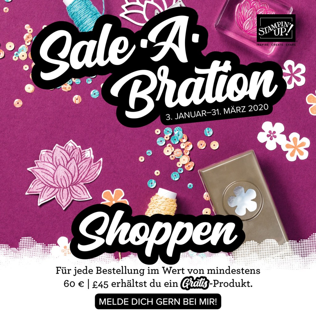 heute erfahrt ihr auf meinem Blog alles zur Sale-A-Bration 2020: Was ist die Sale-A-Bration? Welche tollen Gratisprodukte gibt es? Wie kann ich bei der Aktion etwas geschenkt bekommen und wie lange dauert sie? Warum lohnt es sich während der Sale-A-Bration bei Stampin‘ Up! einzusteigen? Welche Angebote gibt es für Gastgeberinnen?