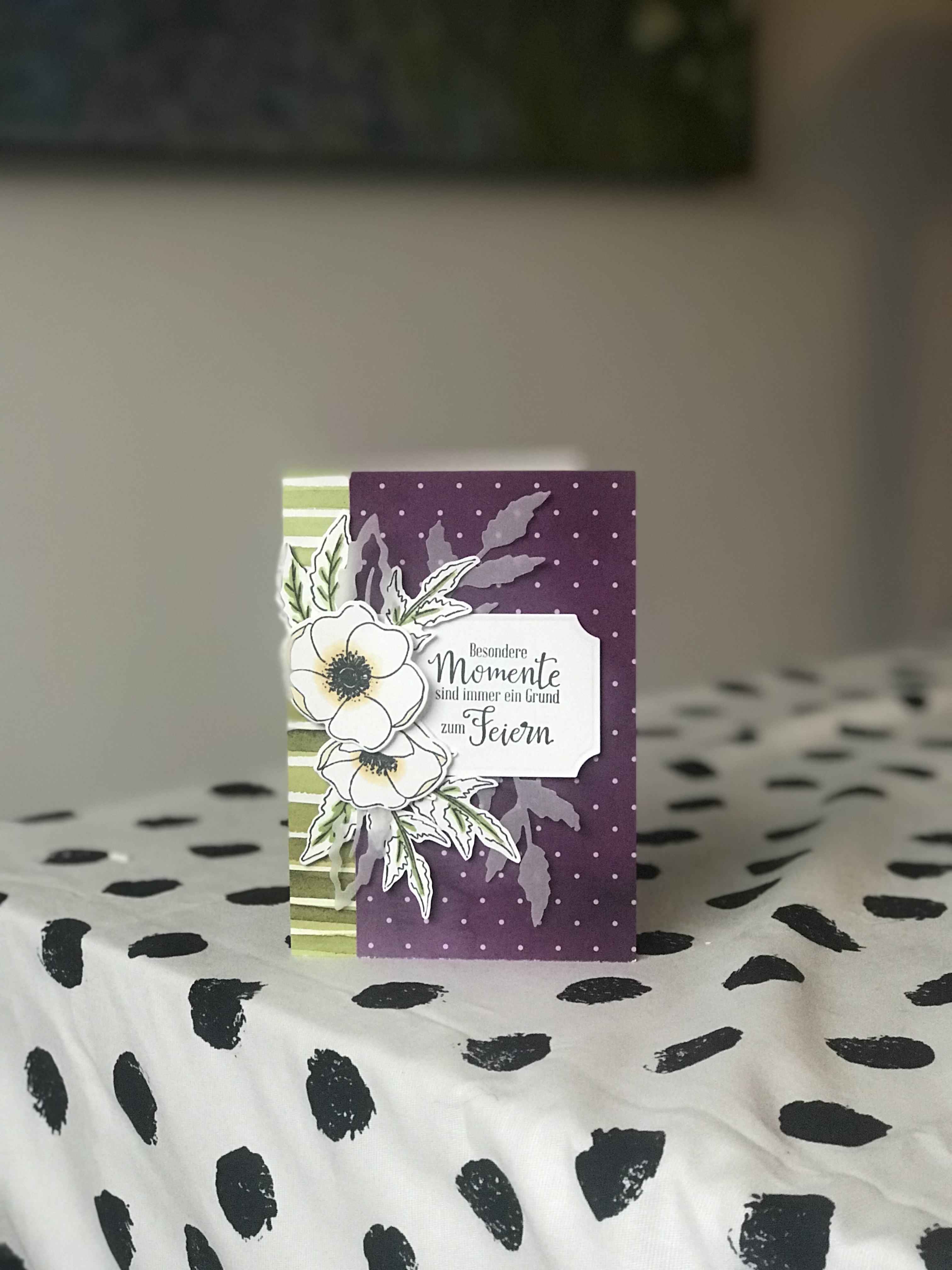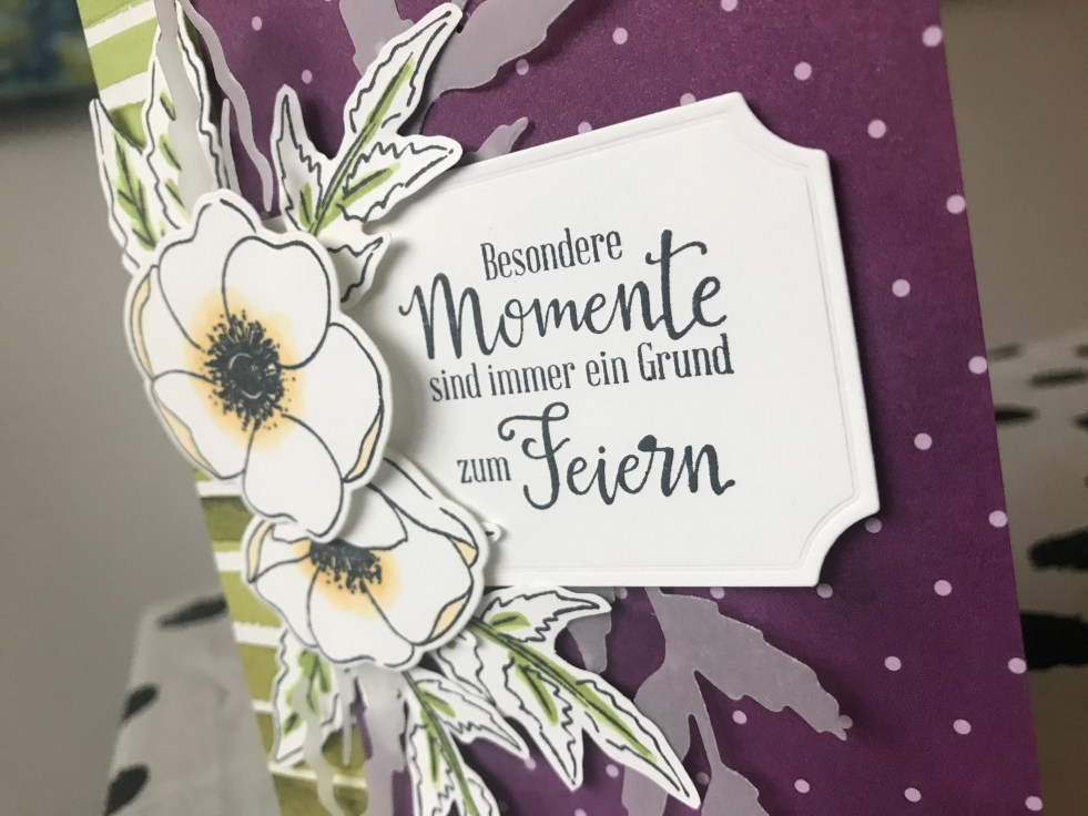 Abgerundet habe ich mein Projekt dann noch mit ein paar Zweigen und Blättern, die ich mit dem Stanzformen „Mohnblüten“ aus Farbkarton Pergament ausgestanzt habe. Alles zusammen mit Dimensionals arrangiert ergibt das eine wunderbare Karte in Brombeermousse, Grüner Apfel, Safrangelb, schwarz und weiß, die ich heute Dominiks Oma zum Geburtstag schenken werde 😊