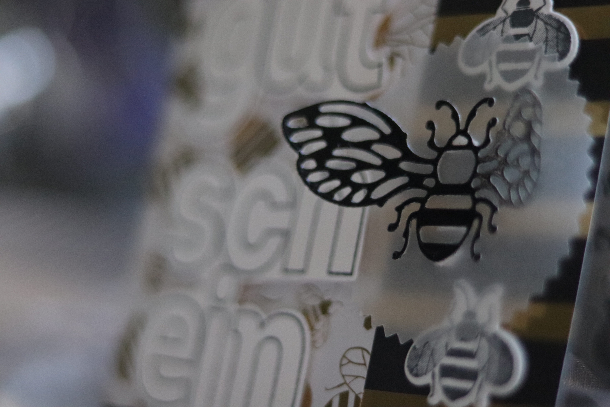 Ich habe für diesen Gutschein eine Grundkarte in schwarz gefaltet und darauf zwei Stücke Designerpapier Bienengold geklebt. Und danach mit dem „Lined Alphabet“ das Wort Gutschein in drei Zeilen gestempelt. Daneben kleben zwei kleine Bienchen, die ich ebenfalls in schwarz gestempelt und dann mit der Stanzmaschine ausgestanzt habe. Die große Biene ist aus dem Folienpapier in schwarz ausgestanzt. Ich liebe diese detaillierten Stanzmotive ganz besonders! 😍 darunter habe ich noch ein Stück Farbkarton Pergament geklebt, dass ich mit der Stanze „Sonne“ ausgestanzt habe.