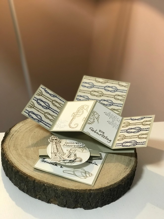 Aufgeklappt wirkt diese Karte gar nicht mehr so einfach, im Gegenteil, der Effekt beim Lösen der Banderole ist einsame Klasse! Ich habe auf der Innenseite ein weiteres Motiv aus dem Designerpapier ‚Meer der Möglichkeiten‘ benutzt und so als dritte Neutralfarbe Marineblau mit ins Spiel gebracht. Das regelmäßige Taumuster hat für mich einen total schönen Kontrast ergeben. In der Mitte habe ich auf die Innenkarten zwei Seepferdchen in Saharasand und die kleinen Punkte in Marineblau gestempelt, aif die untere Innenkarte noch eine große Muschel in Saharasand. Motive, die allesamt mit im Stempelset ‚Mit Meerwert‘ vertreten waren.